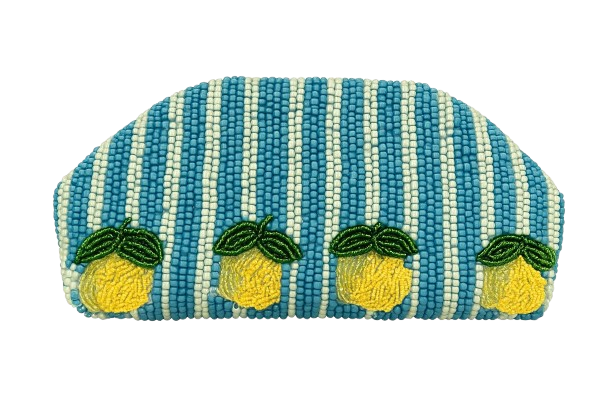 Fresh, fun, and right on trend — NAJM in LEMON brings playful elegance to your wardrobe. Blue-and-turquoise hand-beaded stripes meet cheerful lemon motifs, blending Mediterranean inspiration with a contemporary, fashion-forward twist. Fully padded with velvet lining, it protects your essentials while the roomy interior fits your phone, wallet, sunglasses, and more. A statement clutch that adds edge and personality to any outfit — from summer dresses to sleek sahel looks.